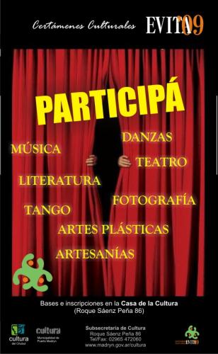 La Secretaría de Cultura y Educación comunica que se encuentra abierta la inscripción para la Etapa Selectiva de los Certámenes Culturales Evita 2009. La misma se llevará a cabo el próximo 13 de junio en Rawson. De esta etapa tomarán parte representantes de las ciudades de Trelew y Puerto Madryn por lo que se espera el arribo de un importante número de participantes.